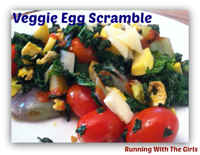 Eggs are an easy go-to in my house, especially since we have our own farm fresh eggs right here. While the family would much rather I make regular scrambled eggs, I prefer sautéing up some veggies first (because they take longer to cook than the eggs) and then add in 2 to 3 eggs and then stir a bit and let it cook for a few minutes on the stove. This whole process usually only takes me less than 10 minutes, so it is definitely a quick and easy breakfast even on mornings where I have to go to work! In this picture I have chopped onions, diced purple peppers, kale, and tomatoes (added just before the eggs). Then I added a few slithers of cheddar cheese to the top with a bit of salt.